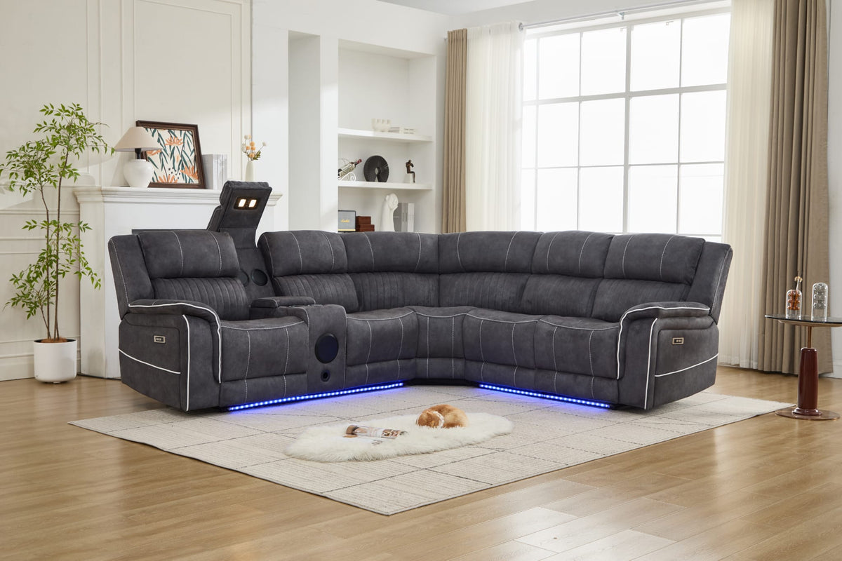 Grey Fabric Reclining Corner Sectional Sofa with LED Lights