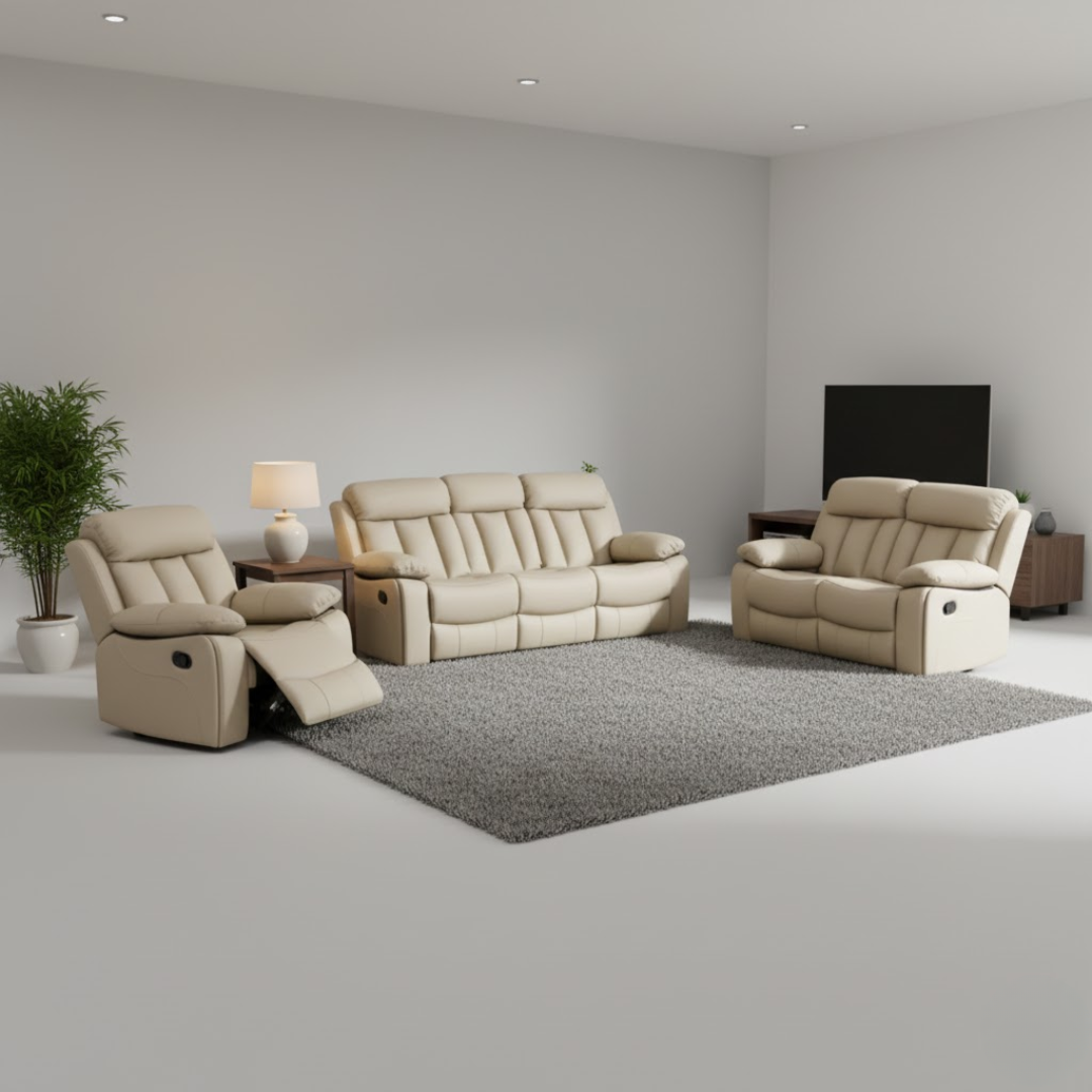 The Pearl Taupe Eco Leather Recliner Sofa Set brings modern comfort and timeless elegance together in one luxurious package. Wrapped in premium eco-leather upholstery, its soft pearl-taupe shade adds a warm, contemporary touch to any living room. The smooth texture and refined finish give it a high-end look while remaining durable and easy to maintain.